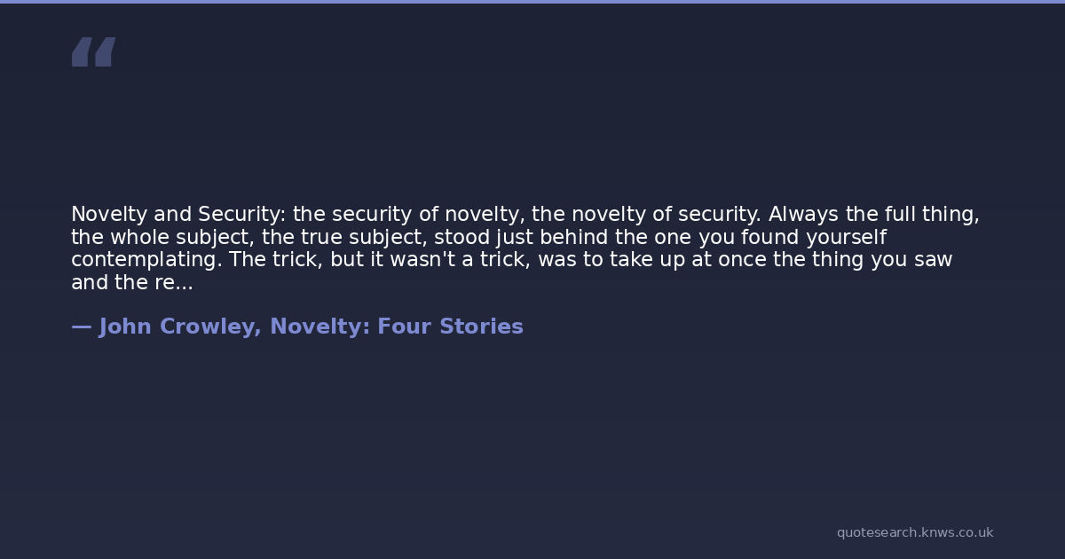 Novelty and Security: the security of novelty, the novelty of security. Always the full thing, the whole subject, the true subject, stood just behind the one you found yourself contemplating. The trick, but it wasn't a trick, was to take up at once the thing you saw and the reason you saw it as well; to always bite off more than you could chew, and then chew it. If it were self-indulgence for him to cut and polish his semiprecious memories, and yet seem like danger, like a struggle he was unfit for, then self-indulgence was a potent force, he must examine it, he must reckon with it.