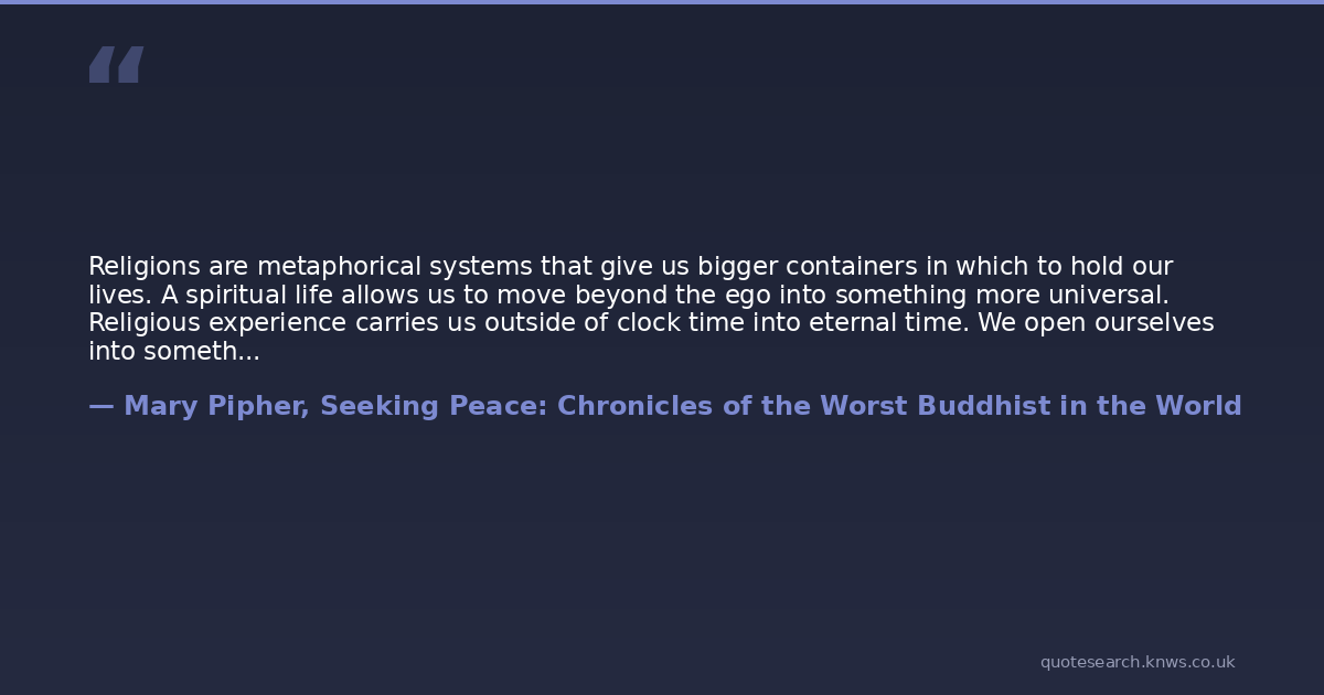 Religions are metaphorical systems that give us bigger containers in which to hold our lives. A spiritual life allows us to move beyond the ego into something more universal. Religious experience carries us outside of clock time into eternal time. We open ourselves into something more complete and beautiful. This bigger vista is perhaps the most magnificent aspect of a religious experience.There is a sense in which Karl Marx was correct when he said that religion is the opiate of the people. However, he was wrong to scoff at this. Religion can give us skills for climbing up on onto a ledge above our suffering and looking down at it with a kind and open mind. This helps us calm down and connect to all of the world's sufferers. Since the beginning of human time, we have yearned for peace in the face of death, loss, anger and fear. In fact, it is often trauma that turns us toward the sacred, and it is the sacred that saves us.