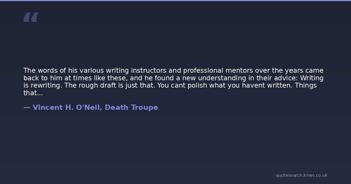 The words of his various writing instructors and professional mentors over the years came back to him at times like these, and he found a new understanding in their advice: Writing is rewriting. The rough draft is just that. You cant polish what you havent written. Things that made for a normal lifelike a daily routine that followed the suntook a back seat to times like these, and he exulted in that change because it served as proof that his writing was indeed the most important thing in his life. It wasnt a conscious choice on his part, like deciding to repaint the bathroom or go buy the groceries, but an overarching reallocation of his existence that was as undeniable as breathing. Day turned into night, breakfast turned into dinner, and the laptop or the writing tablet beckoned even when he was asleep. He would often awake with a new ideaas if hed merely been on a break and not unconsciousand he would see the empty seat before the desk not as his station in some pointless assembly line, but as the pilots seat in a ship that could go anywhere.