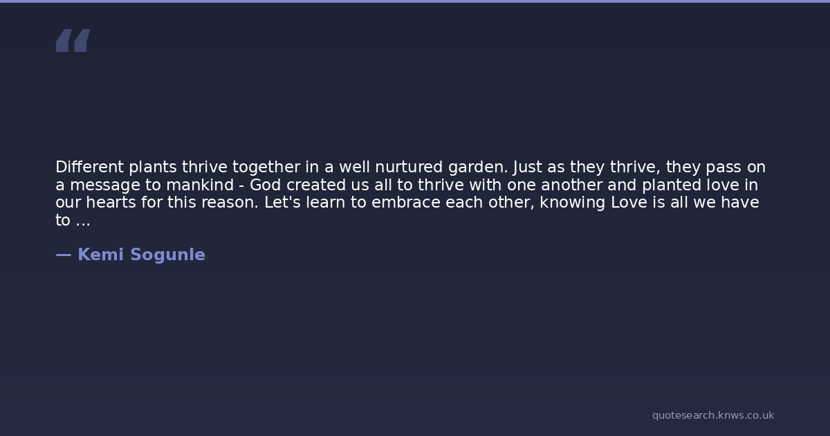 Different plants thrive together in a well nurtured garden. Just as they thrive, they pass on a message to mankind - God created us all to thrive with one another and planted love in our hearts for this reason. Let's learn to embrace each other, knowing Love is all we have to keep us growing and going.