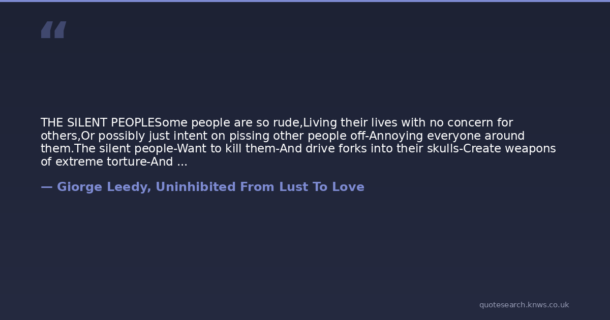 THE SILENT PEOPLESome people are so rude,Living their lives with no concern for others,Or possibly just intent on pissing other people off-Annoying everyone around them.The silent people-Want to kill them-And drive forks into their skulls-Create weapons of extreme torture-And scream from the top of their lungs-"SHUT UP."But words are not spoken-And attention is not given.Though annoyance is apparent,The annoying keep on living.