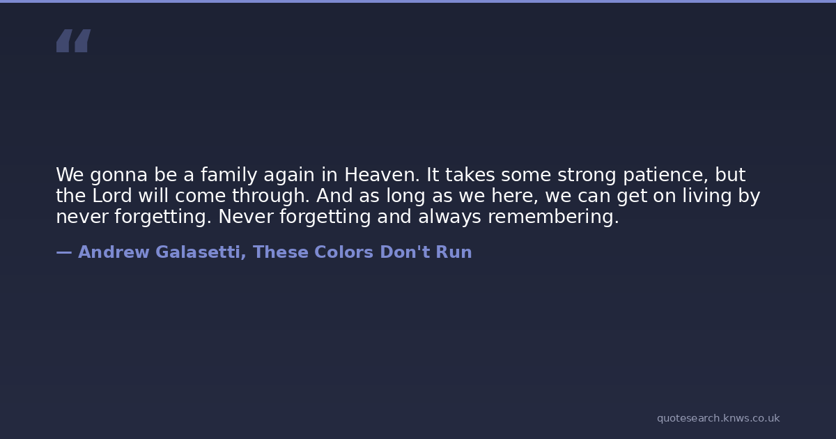 We gonna be a family again in Heaven. It takes some strong patience, but the Lord will come through. And as long as we here, we can get on living by never forgetting. Never forgetting and always remembering.