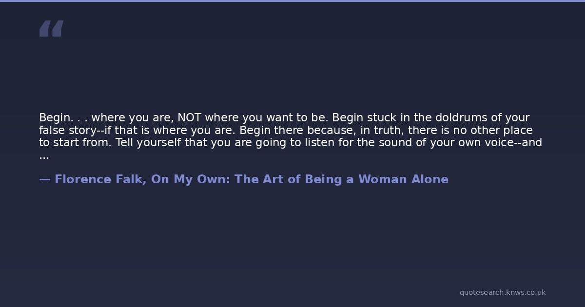 Begin. . . where you are, NOT where you want to be. Begin stuck in the doldrums of your false story--if that is where you are. Begin there because, in truth, there is no other place to start from. Tell yourself that you are going to listen for the sound of your own voice--and remind yourself when you forget. And you will forget, over and over again.