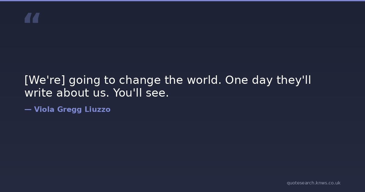 [We're] going to change the world. One day they'll write about us. You'll see. activist change-the-world civil-rights history humanity inspirational-quotes one-day peace people quotes see women write you-will Download Image Share on X Share on Facebook Copy Link
