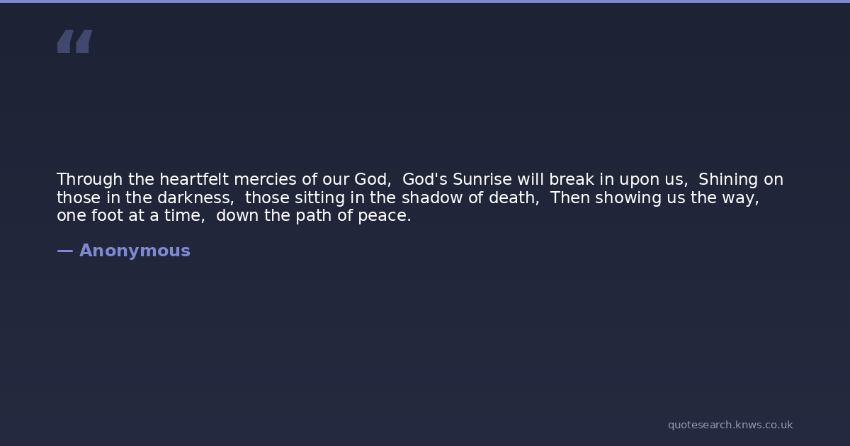 Through the heartfelt mercies of our God, God's Sunrise will break in upon us, Shining on those in the darkness, those sitting in the shadow of death, Then showing us the way, one foot at a time, down the path of peace.
