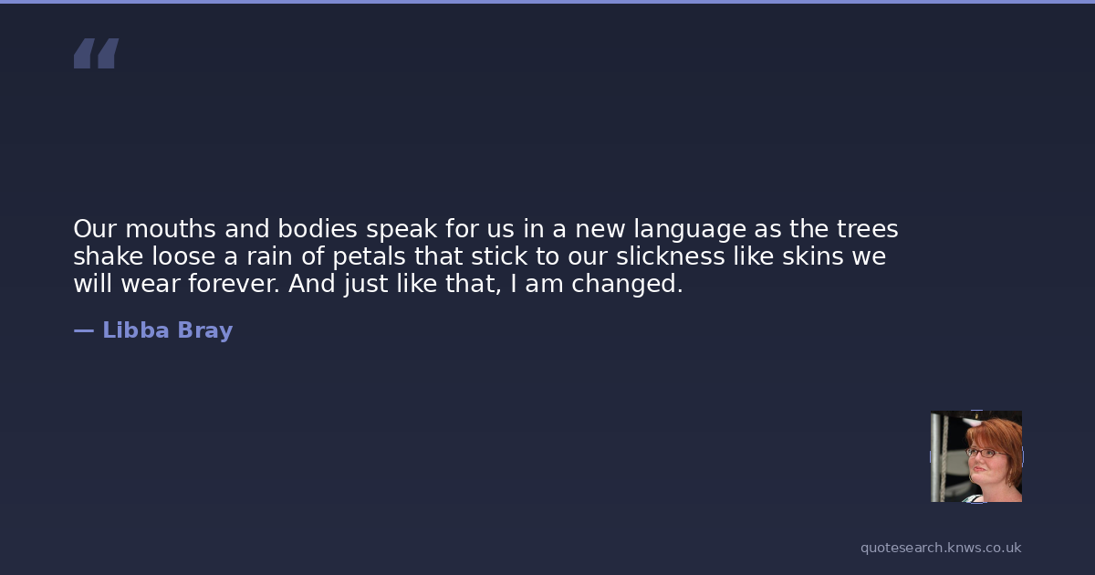 Our mouths and bodies speak for us in a new language as the trees shake loose a rain of petals that stick to our slickness like skins we will wear forever. And just like that, I am changed.
