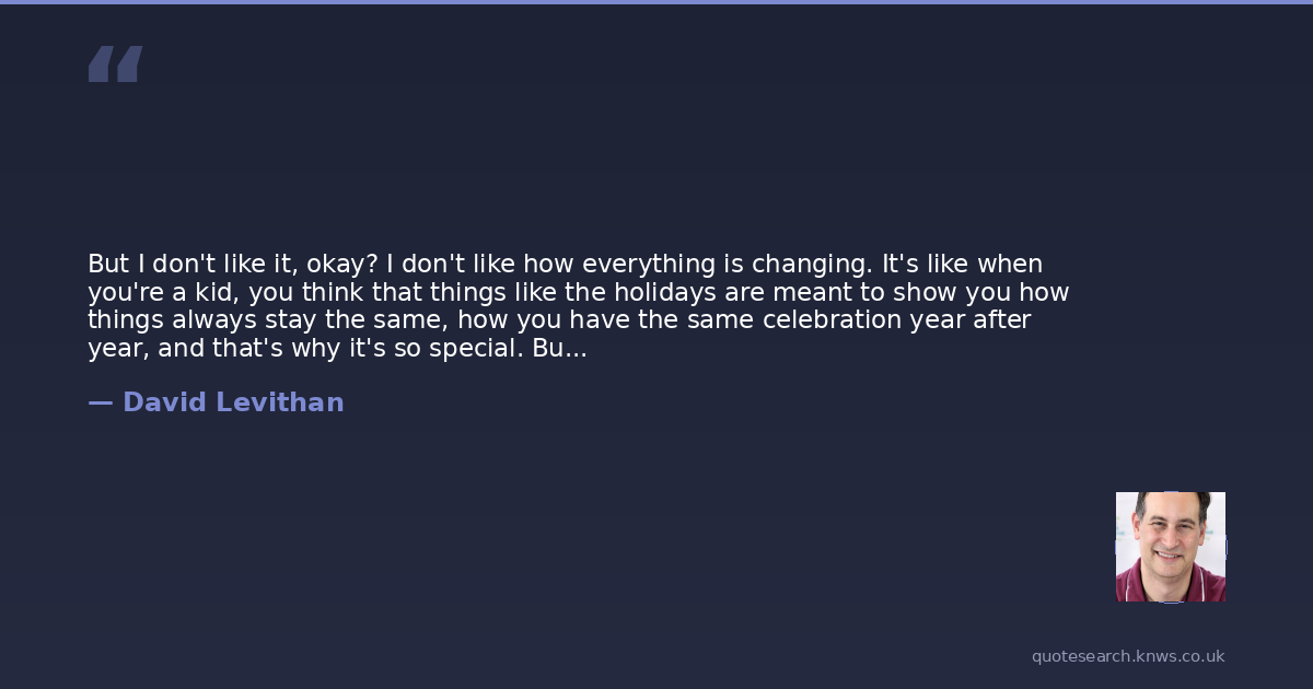 But I don't like it, okay? I don't like how everything is changing. It's like when you're a kid, you think that things like the holidays are meant to show you how things always stay the same, how you have the same celebration year after year, and that's why it's so special. But the older you get, the more you realize that, yes, there are all these things that link you to the past, and you're using the same words and singing the same songs that have always been there for you, but each time, things have shifted, and you have to deal with that shift. Because maybe you don't notice it every single day. Maybe it's only on days like today that you notice it a lot. And I know I'm supposed to be able to deal with that, but I'm not sure I can deal with that.--David Levithan (p. 201 in galley)