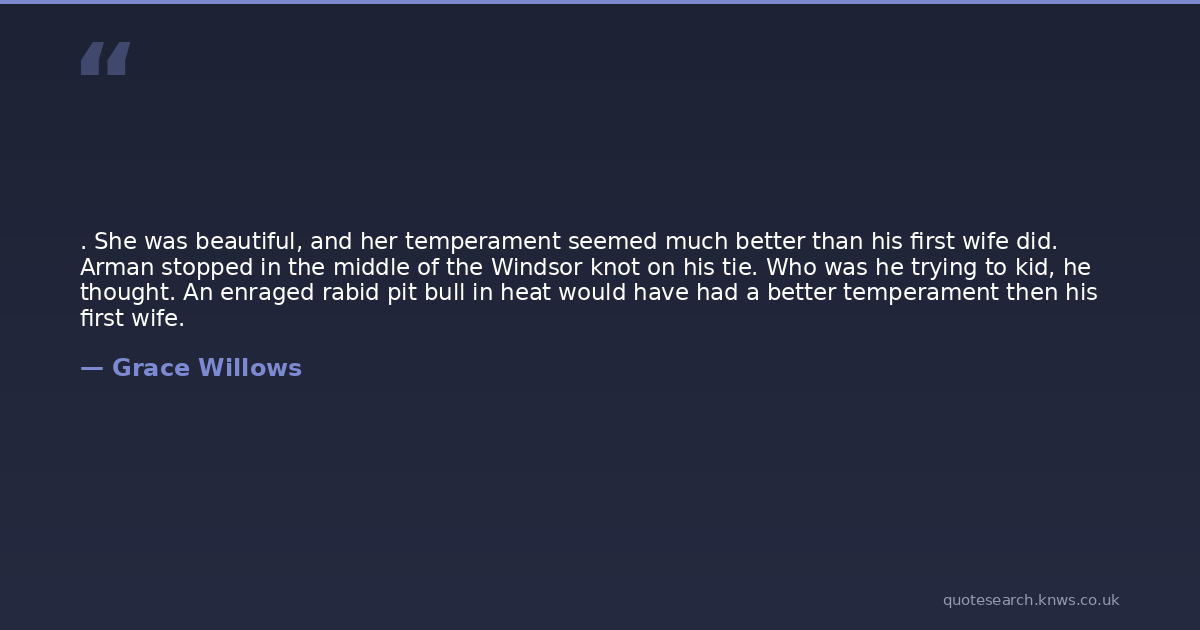 . She was beautiful, and her temperament seemed much better than his first wife did. Arman stopped in the middle of the Windsor knot on his tie. Who was he trying to kid, he thought. An enraged rabid pit bull in heat would have had a better temperament then his first wife.