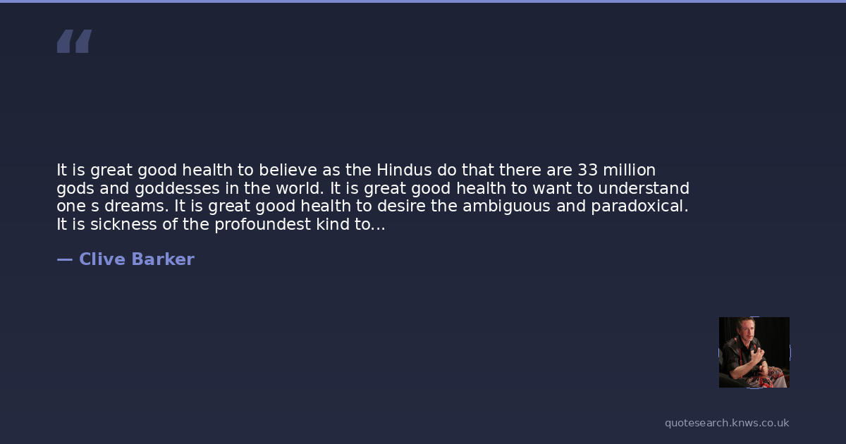It is great good health to believe as the Hindus do that there are 33 million gods and goddesses in the world. It is great good health to want to understand one s dreams. It is great good health to desire the ambiguous and paradoxical. It is sickness of the profoundest kind to believe that there is one reality. There is sickness in any piece of work or any piece of art seriously attempting to suggest that the idea that there is more than one reality is somehow redundant.