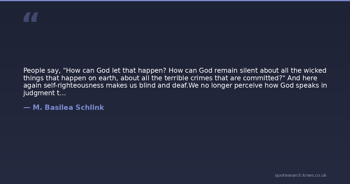 People say, "How can God let that happen? How can God remain silent about all the wicked things that happen on earth, about all the terrible crimes that are committed?" And here again self-righteousness makes us blind and deaf.We no longer perceive how God speaks in judgment through wars and all the other troubles in the world. Yes, He is speaking powerfully. Such judgments are His last attempt to win us back in love.
