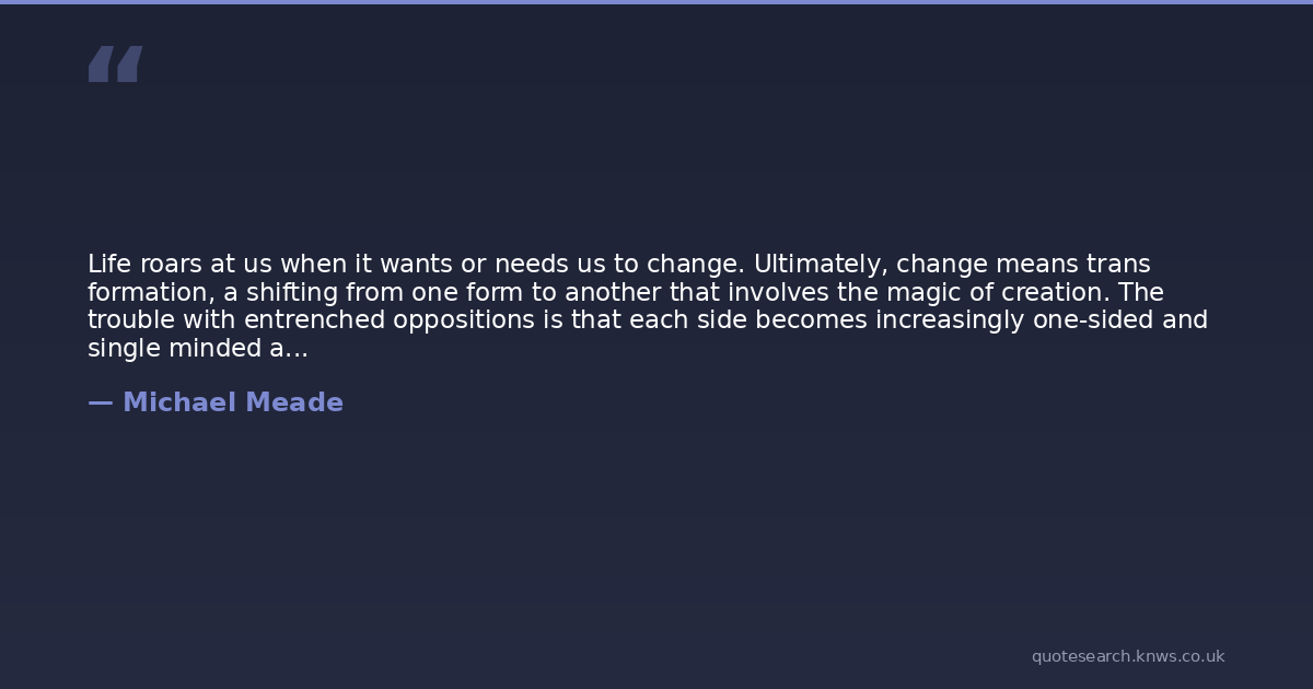Life roars at us when it wants or needs us to change. Ultimately, change means trans formation, a shifting from one form to another that involves the magic of creation. The trouble with entrenched oppositions is that each side becomes increasingly one-sided and single minded and unable to grow or meaningfully change. In the blindness of fear and the willfulness of abstract beliefs, people forget or reject the unseen yet essential unity that underlies all the oppositions in life.
