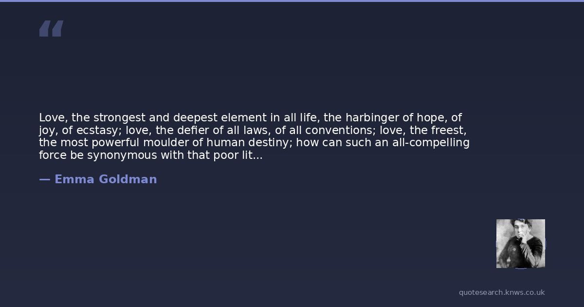 Love, the strongest and deepest element in all life, the harbinger of hope, of joy, of ecstasy; love, the defier of all laws, of all conventions; love, the freest, the most powerful moulder of human destiny; how can such an all-compelling force be synonymous with that poor little State and Church-begotten weed, marriage?