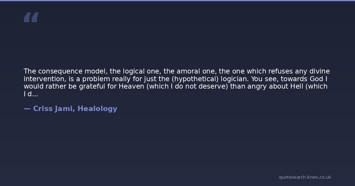 The consequence model, the logical one, the amoral one, the one which refuses any divine intervention, is a problem really for just the (hypothetical) logician. You see, towards God I would rather be grateful for Heaven (which I do not deserve) than angry about Hell (which I do deserve). By this the logician within must choose either atheism or theism, but he cannot possibly through good reason choose anti-theism. For his friend in this case is not at all mathematical law: the law in that 'this equation, this path will consequently direct me to a specific point'; over the alternative and the one he denies, 'God will send me wherever and do it strictly for his own sovereign amusement.' The consequence model, the former, seeks the absence of God, which orders he cannot save one from one's inevitable consequences; hence the angry anti-theist within, 'the logical one', the one who wants to be master of his own fate, can only contradict himself - I do not think it wise to be angry at math.