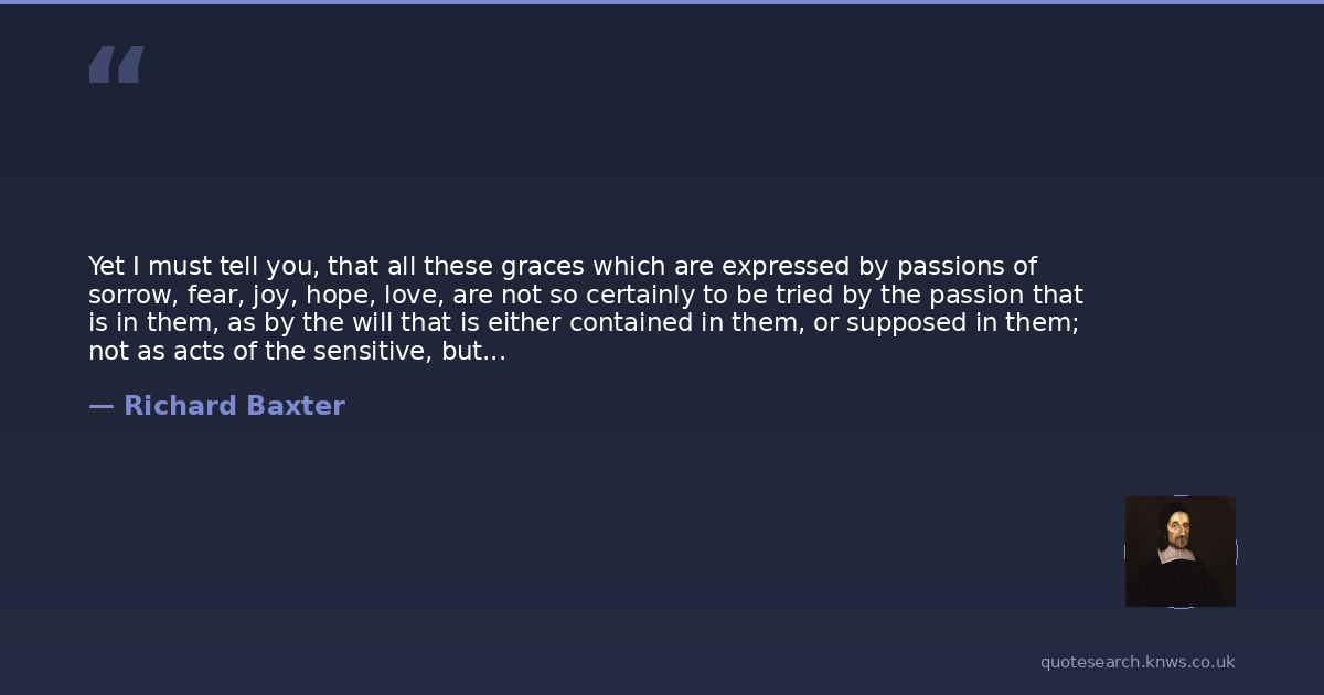 Yet I must tell you, that all these graces which are expressed by passions of sorrow, fear, joy, hope, love, are not so certainly to be tried by the passion that is in them, as by the will that is either contained in them, or supposed in them; not as acts of the sensitive, but of the rational appetite (358).