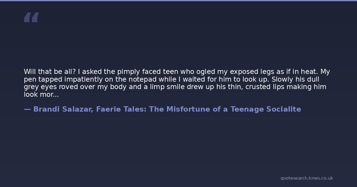 Will that be all? I asked the pimply faced teen who ogled my exposed legs as if in heat. My pen tapped impatiently on the notepad while I waited for him to look up. Slowly his dull grey eyes roved over my body and a limp smile drew up his thin, crusted lips making him look more weasel than human. Yep. Thatd be it, his cheerful, adolescent voice cracked.Great, I mumbled, walking back behind the counter.