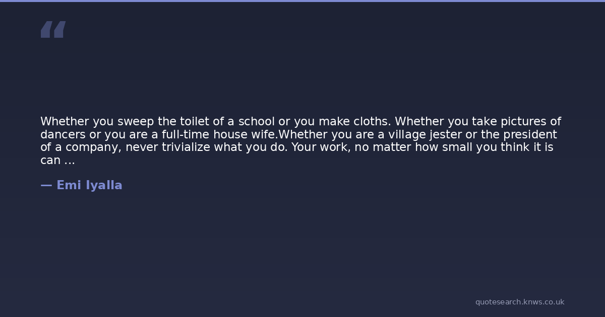 Whether you sweep the toilet of a school or you make cloths. Whether you take pictures of dancers or you are a full-time house wife.Whether you are a village jester or the president of a company, never trivialize what you do. Your work, no matter how small you think it is can make a difference in someone's life. It all begins with you. It's not what you do, it's how you do it.I have seen a traffic police bring minutes of joy and happiness to people's lives in a way that Presidents of nations cannot. Anytime you trivialize what gives you an income, you sell yourself cheap and lose your dignity. Do your work with all excitement, joy and positivity. Learn and grow from it. And if you haven't found a job to do, look for one with the same zeal as you would do the actual work. Good morning and may God bless our efforts. Emi Iyalla