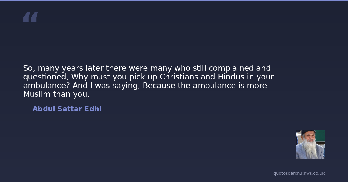 So, many years later there were many who still complained and questioned, Why must you pick up Christians and Hindus in your ambulance? And I was saying, Because the ambulance is more Muslim than you.