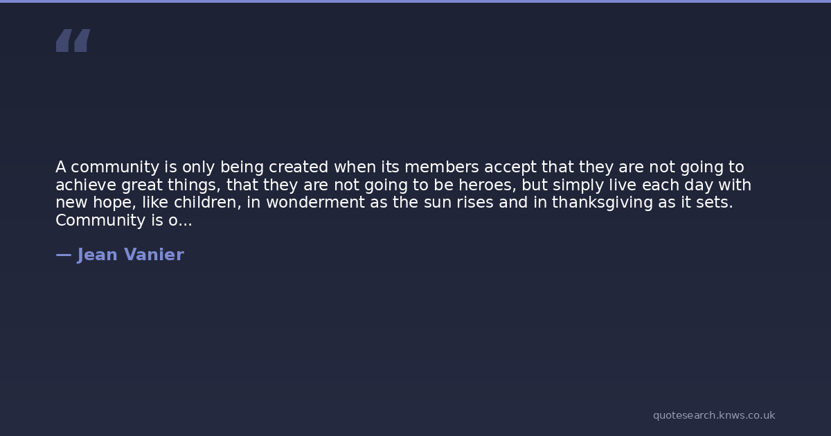 A community is only being created when its members accept that they are not going to achieve great things, that they are not going to be heroes, but simply live each day with new hope, like children, in wonderment as the sun rises and in thanksgiving as it sets. Community is only being created when they have recognized that the greatness of man is to accept his insignificance, his human condition and his earth, and to thank God for having put in a finite body the seeds of eternity which are visible in small and daily gestures of love and forgiveness. The beauty of man is in this fidelity to the wonder of each day.