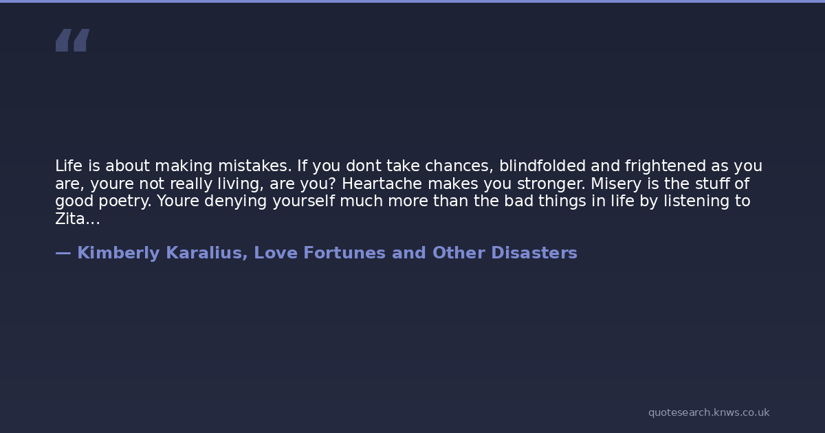 Life is about making mistakes. If you dont take chances, blindfolded and frightened as you are, youre not really living, are you? Heartache makes you stronger. Misery is the stuff of good poetry. Youre denying yourself much more than the bad things in life by listening to Zitas fortunes.