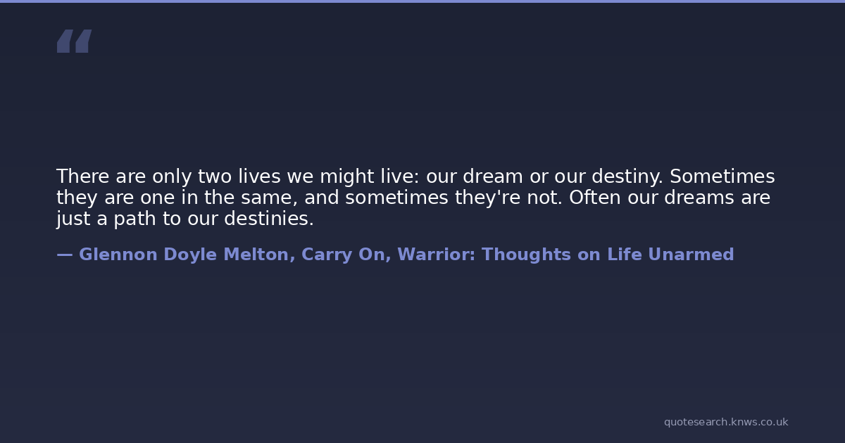 There are only two lives we might live: our dream or our destiny. Sometimes they are one in the same, and sometimes they're not. Often our dreams are just a path to our destinies.