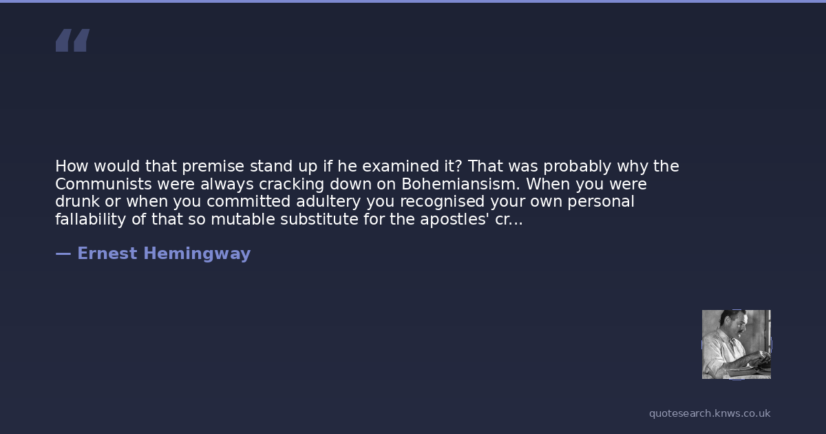 How would that premise stand up if he examined it? That was probably why the Communists were always cracking down on Bohemiansism. When you were drunk or when you committed adultery you recognised your own personal fallability of that so mutable substitute for the apostles' creed, the party line. Down with Bohemianism, the sin of Majakowski.