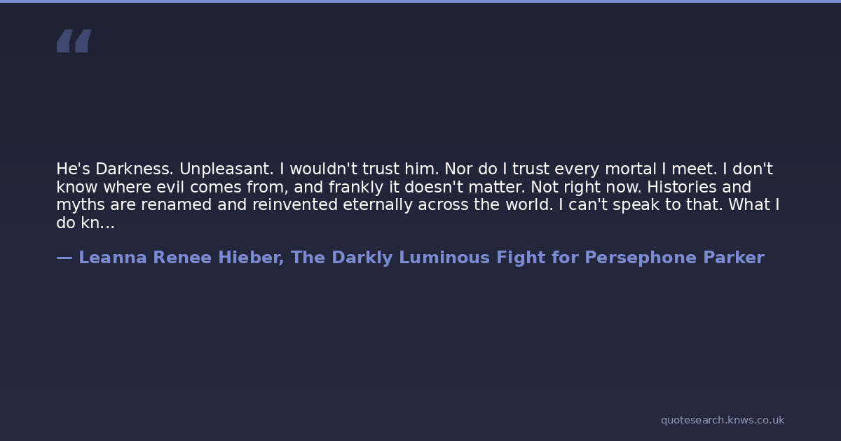 He's Darkness. Unpleasant. I wouldn't trust him. Nor do I trust every mortal I meet. I don't know where evil comes from, and frankly it doesn't matter. Not right now. Histories and myths are renamed and reinvented eternally across the world. I can't speak to that. What I do know? This is your story.