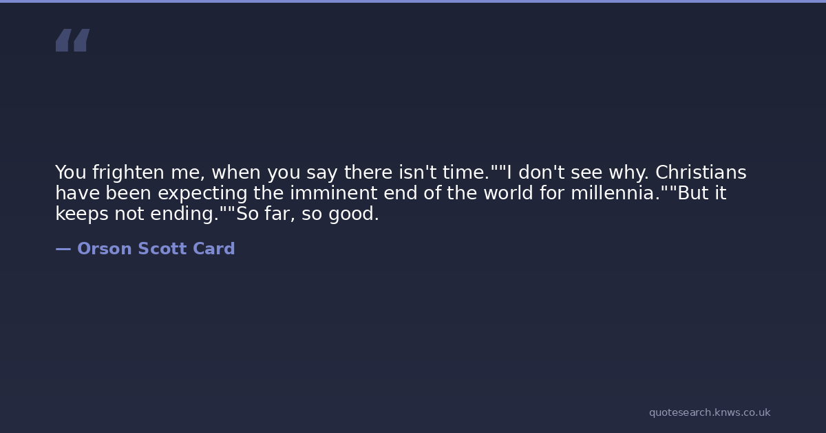 You frighten me, when you say there isn't time.""I don't see why. Christians have been expecting the imminent end of the world for millennia.""But it keeps not ending.""So far, so good.