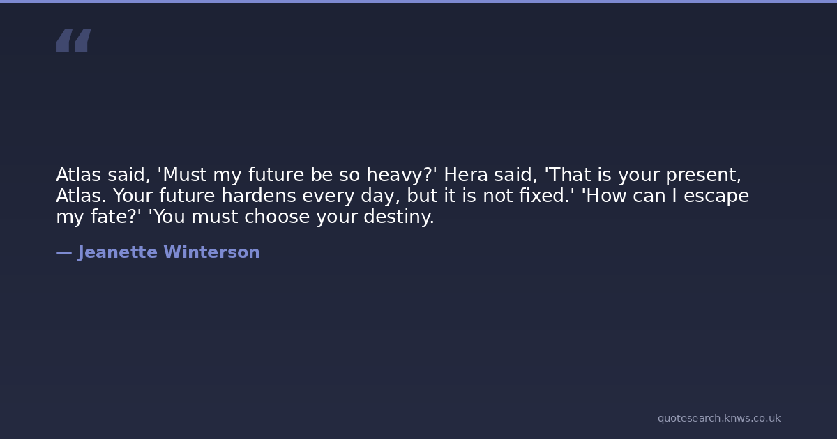 Atlas said, 'Must my future be so heavy?' Hera said, 'That is your present, Atlas. Your future hardens every day, but it is not fixed.' 'How can I escape my fate?' 'You must choose your destiny.