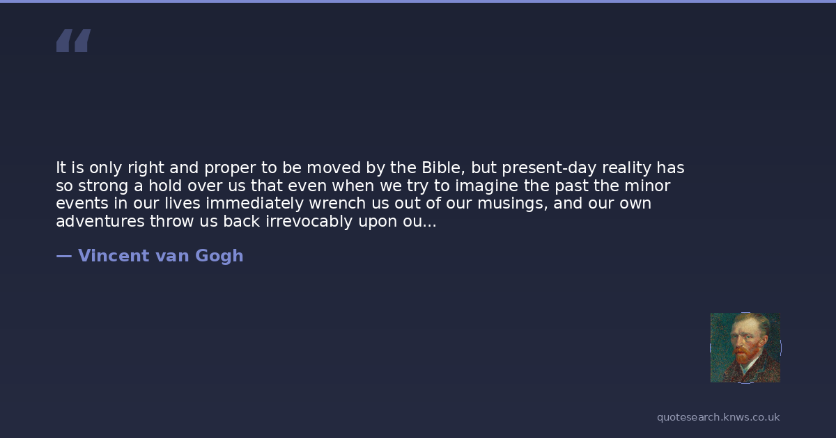 It is only right and proper to be moved by the Bible, but present-day reality has so strong a hold over us that even when we try to imagine the past the minor events in our lives immediately wrench us out of our musings, and our own adventures throw us back irrevocably upon our personal feelingsjoy, boredom, suffering, anger, or a smile.