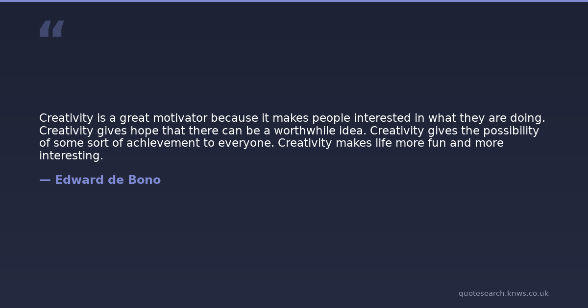 Creativity is a great motivator because it makes people interested in what they are doing. Creativity gives hope that there can be a worthwhile idea. Creativity gives the possibility of some sort of achievement to everyone. Creativity makes life more fun and more interesting.