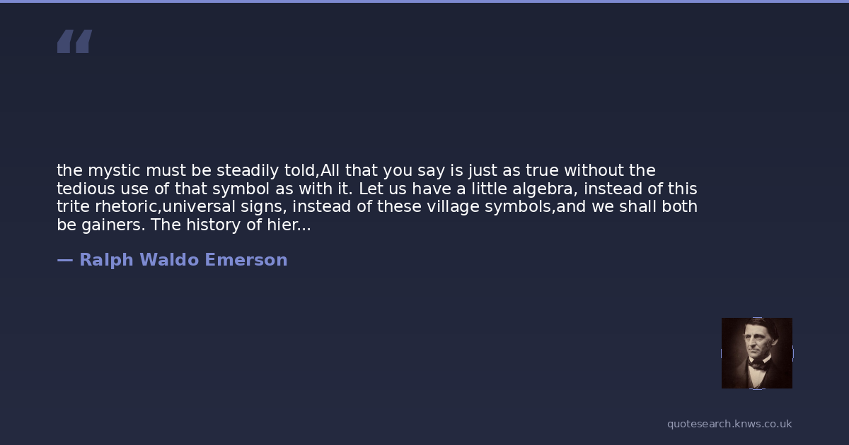 the mystic must be steadily told,All that you say is just as true without the tedious use of that symbol as with it. Let us have a little algebra, instead of this trite rhetoric,universal signs, instead of these village symbols,and we shall both be gainers. The history of hierarchies seems to show that all religious error consisted in making the symbol too stark and solid, and was at last nothing but an excess of the organ of language.