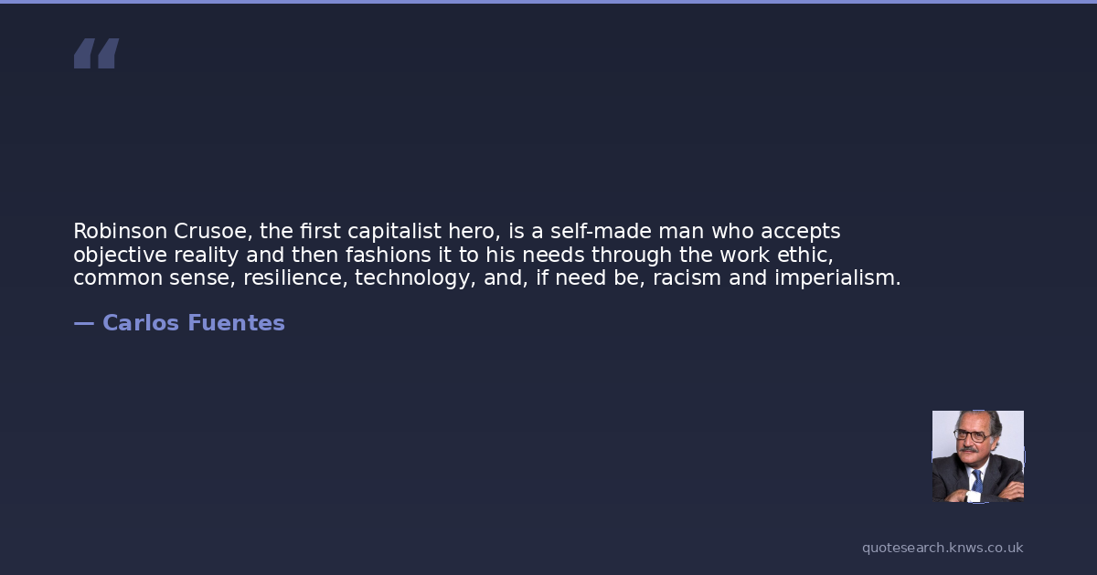 Robinson Crusoe, the first capitalist hero, is a self-made man who accepts objective reality and then fashions it to his needs through the work ethic, common sense, resilience, technology, and, if need be, racism and imperialism.