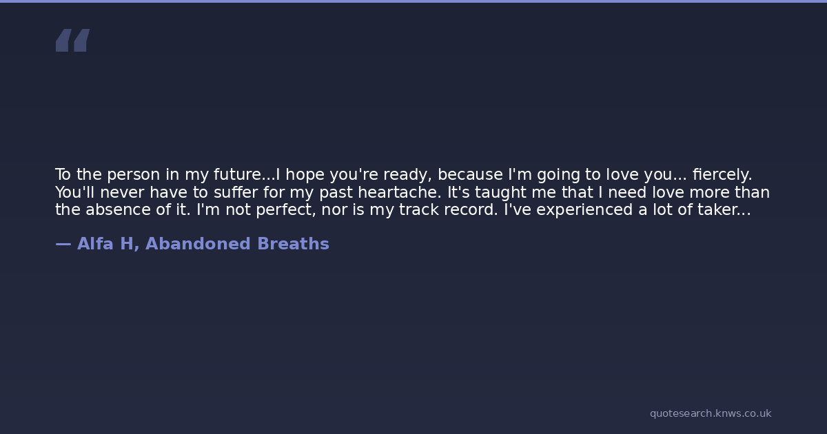 To the person in my future...I hope you're ready, because I'm going to love you... fiercely. You'll never have to suffer for my past heartache. It's taught me that I need love more than the absence of it. I'm not perfect, nor is my track record. I've experienced a lot of takers in my life - but I'll love you with every part of me that remains.