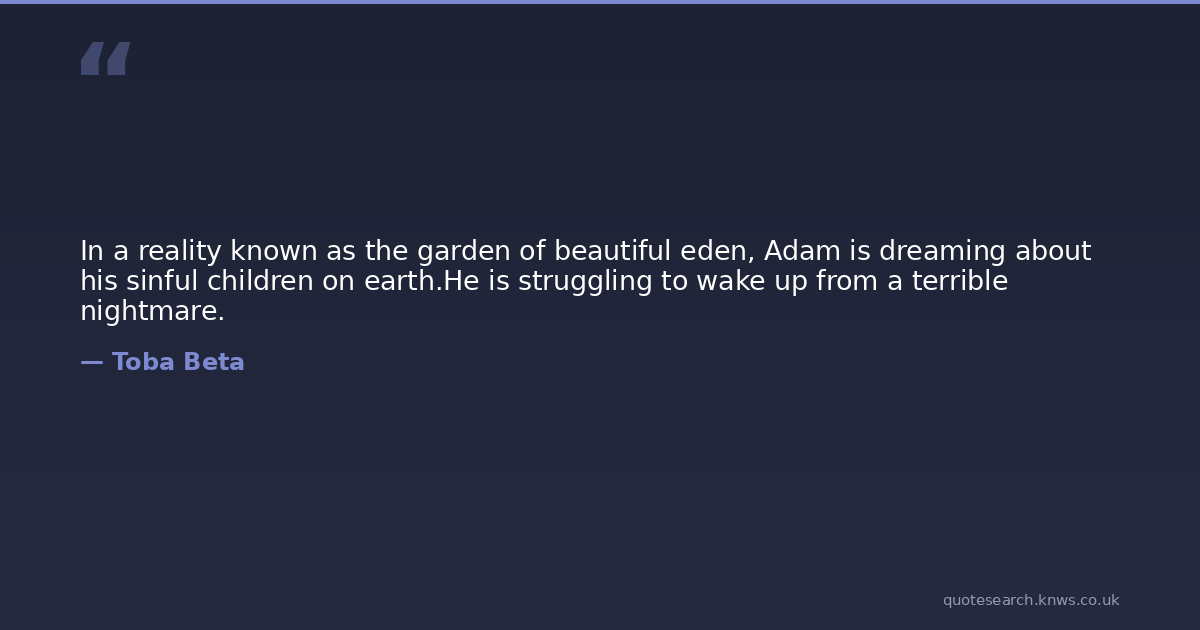 In a reality known as the garden of beautiful eden, Adam is dreaming about his sinful children on earth.He is struggling to wake up from a terrible nightmare.