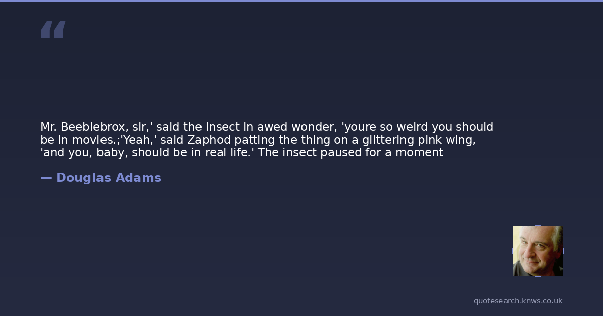 Mr. Beeblebrox, sir,' said the insect in awed wonder, 'youre so weird you should be in movies.;'Yeah,' said Zaphod patting the thing on a glittering pink wing, 'and you, baby, should be in real life.' The insect paused for a moment