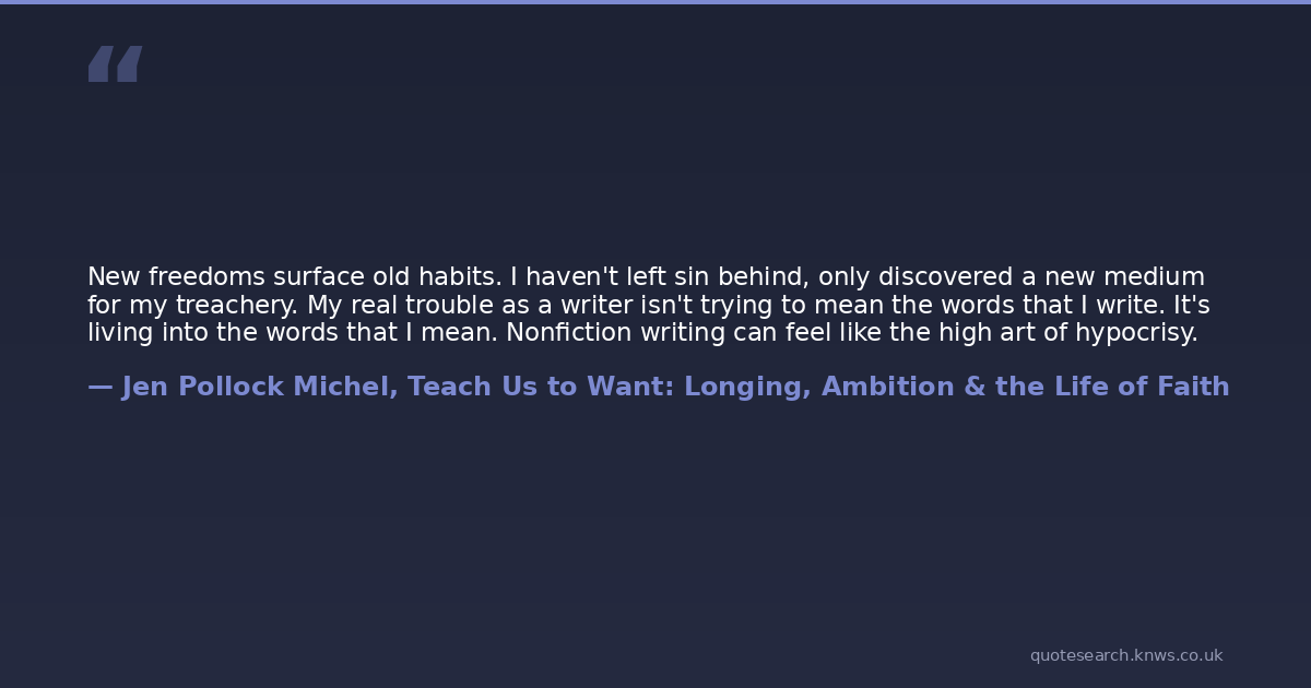 New freedoms surface old habits. I haven't left sin behind, only discovered a new medium for my treachery. My real trouble as a writer isn't trying to mean the words that I write. It's living into the words that I mean. Nonfiction writing can feel like the high art of hypocrisy.