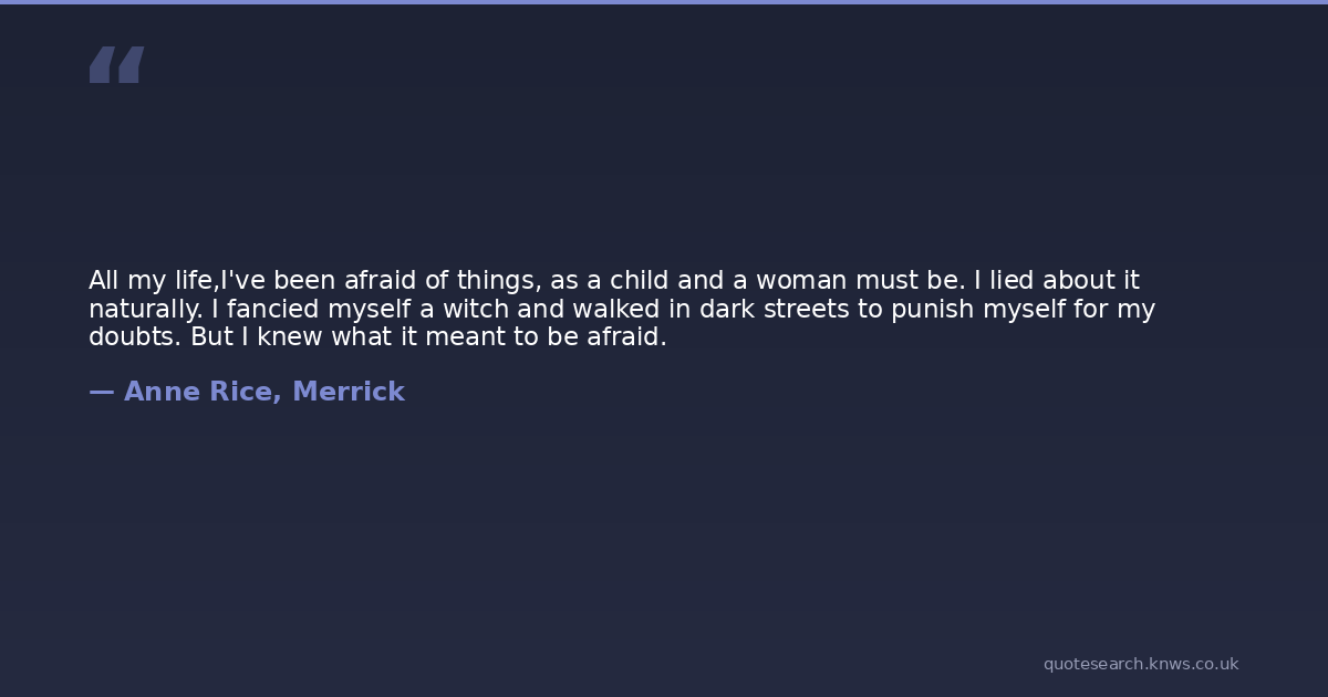 All my life,I've been afraid of things, as a child and a woman must be. I lied about it naturally. I fancied myself a witch and walked in dark streets to punish myself for my doubts. But I knew what it meant to be afraid.