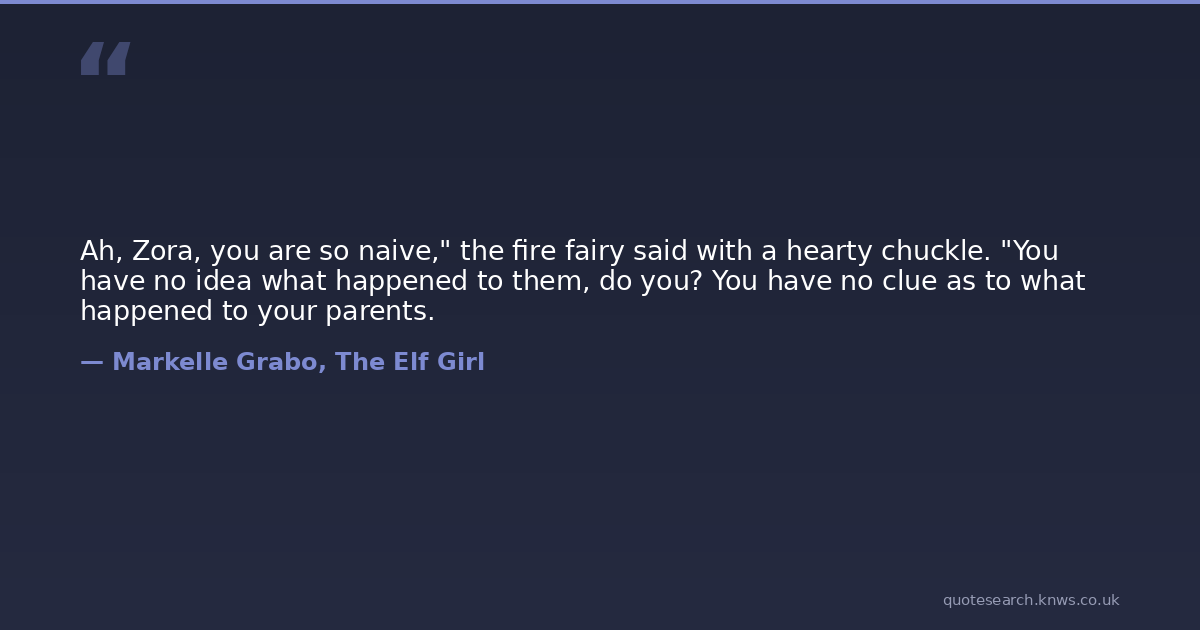 Ah, Zora, you are so naive," the fire fairy said with a hearty chuckle. "You have no idea what happened to them, do you? You have no clue as to what happened to your parents.