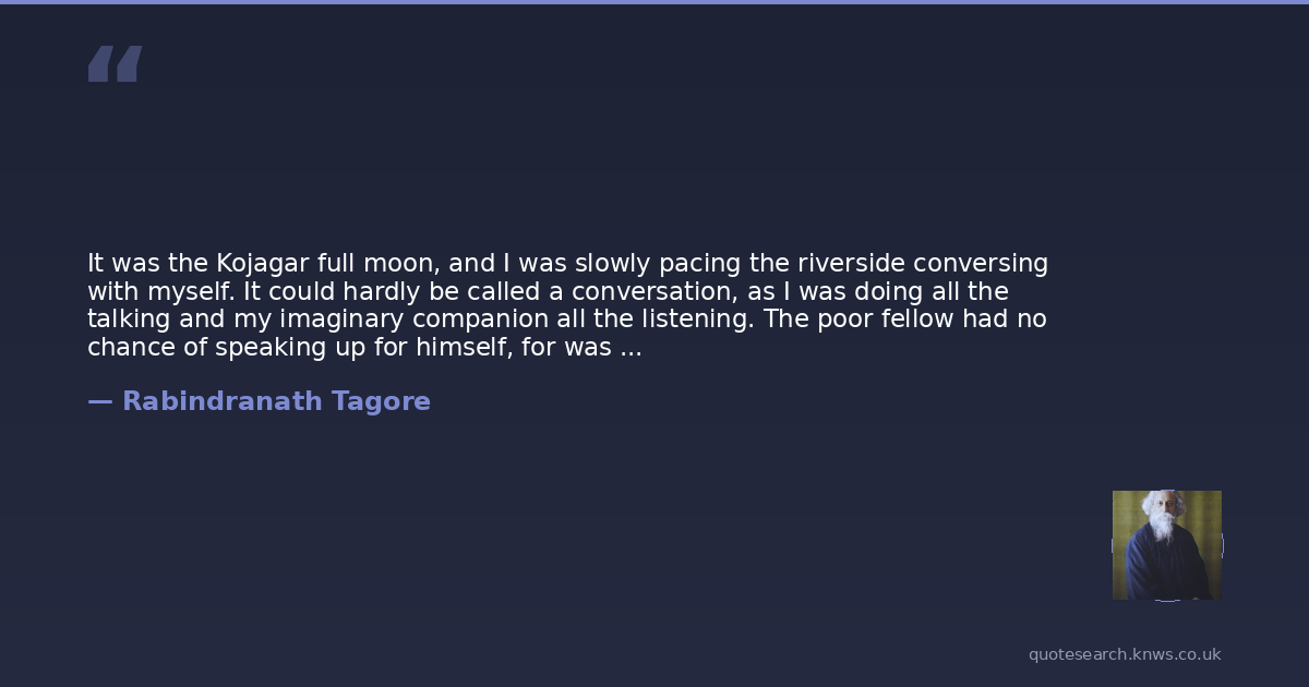 It was the Kojagar full moon, and I was slowly pacing the riverside conversing with myself. It could hardly be called a conversation, as I was doing all the talking and my imaginary companion all the listening. The poor fellow had no chance of speaking up for himself, for was not mine the power to compel him helplessly to answer like a fool?But what a night it was! How often have I tried to write of such, but never got it done! There was not a line of ripple on the river; and from away over there, where the farthest shore of the distant main stream is seen beyond the other edge of the midway belt of sand, right up to this shore, glimmers a broad band of moonlight. Not a human being, not a boat in sight; not a tree, nor blade of grass on the fresh-formed island sand-bank.It seemed as though a desolate moon was rising upon a devastated earth; a random river wandering through a lifeless solitude; a long-drawn fairy-tale coming to a close over a deserted world,all the kings and the princesses, their ministers and friends and their golden castles vanished, leaving the Seven Seas and Thirteen Rivers and the Unending Moor, over which the adventurous princes fared forth, wanly gleaming in the pale moonlight. I was pacing up and down like the last pulse-beats of this dying world. Every one else seemed to be on the opposite shorethe shore of lifewhere the British Government and the Nineteenth Century hold sway, and tea and cigarettes.