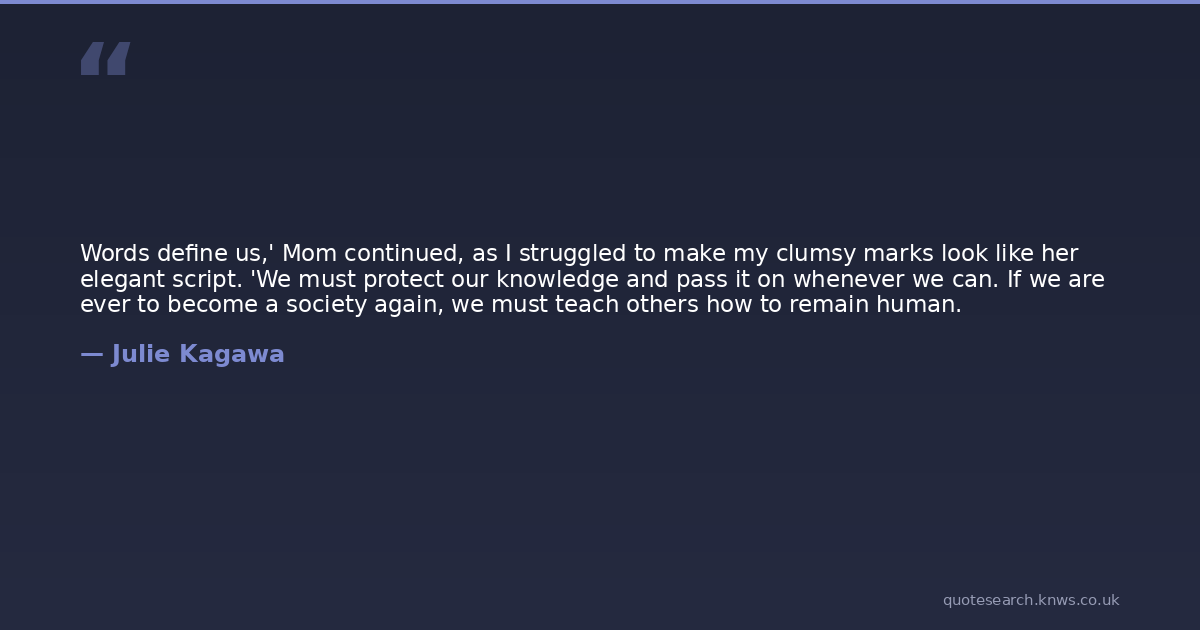 Words define us,' Mom continued, as I struggled to make my clumsy marks look like her elegant script. 'We must protect our knowledge and pass it on whenever we can. If we are ever to become a society again, we must teach others how to remain human.