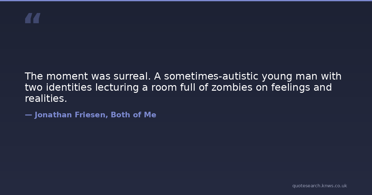 The moment was surreal. A sometimes-autistic young man with two identities lecturing a room full of zombies on feelings and realities.