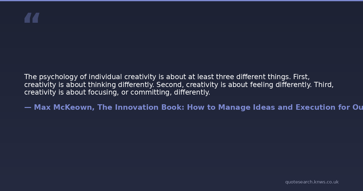 The psychology of individual creativity is about at least three different things. First, creativity is about thinking differently. Second, creativity is about feeling differently. Third, creativity is about focusing, or committing, differently.