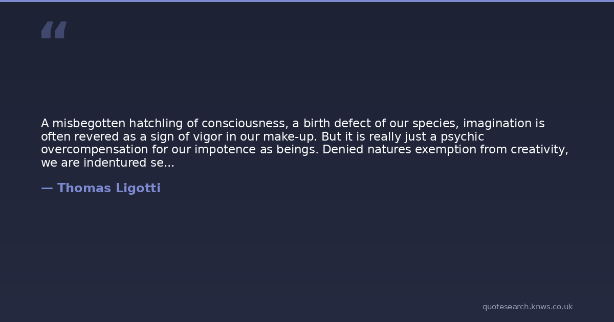 A misbegotten hatchling of consciousness, a birth defect of our species, imagination is often revered as a sign of vigor in our make-up. But it is really just a psychic overcompensation for our impotence as beings. Denied natures exemption from creativity, we are indentured servants of the imaginary until the hour of our death, when the final harassments of imagination will beset us.