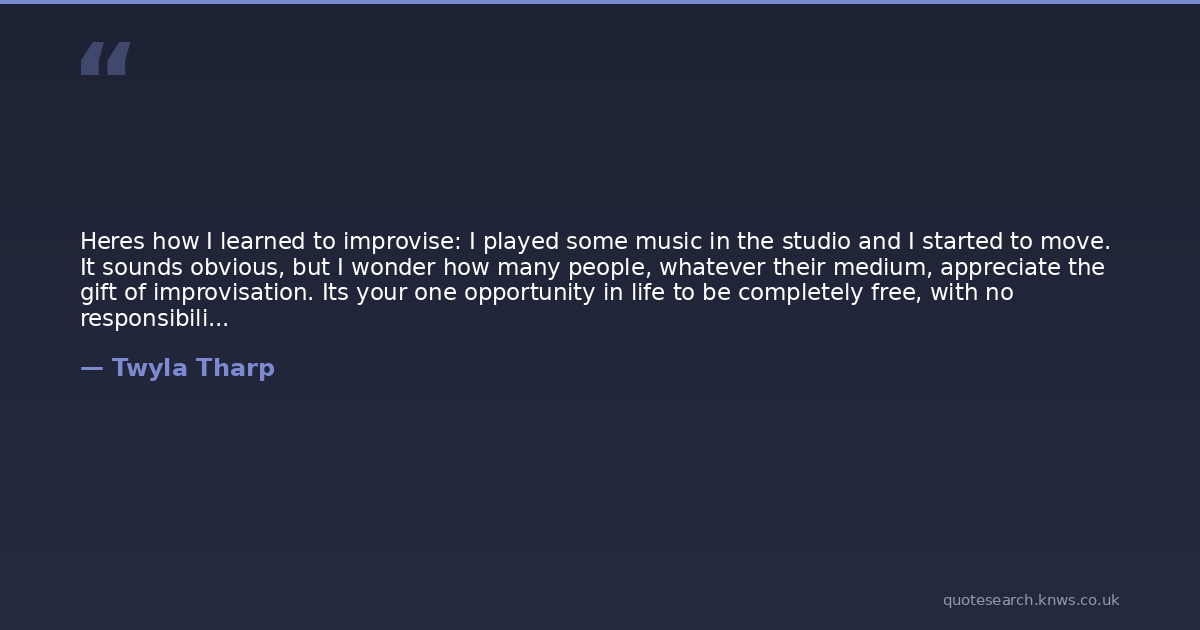 Heres how I learned to improvise: I played some music in the studio and I started to move. It sounds obvious, but I wonder how many people, whatever their medium, appreciate the gift of improvisation. Its your one opportunity in life to be completely free, with no responsibilities and no consequences. You dont have to be good or even interesting. Its you alone, with no one watching or judging. If anything comes of it, you decide whether the world gets to see it. In essence, you are giving yourself permission to daydream during working hours.