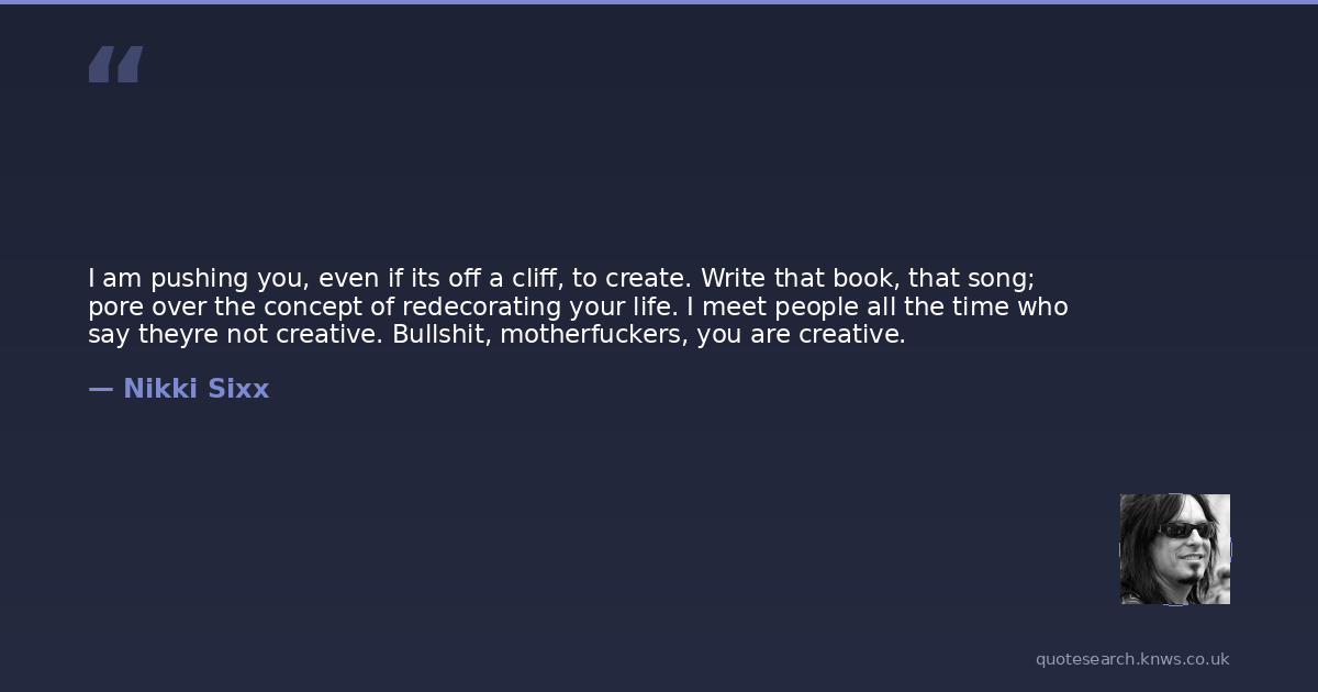 I am pushing you, even if its off a cliff, to create. Write that book, that song; pore over the concept of redecorating your life. I meet people all the time who say theyre not creative. Bullshit, motherfuckers, you are creative.