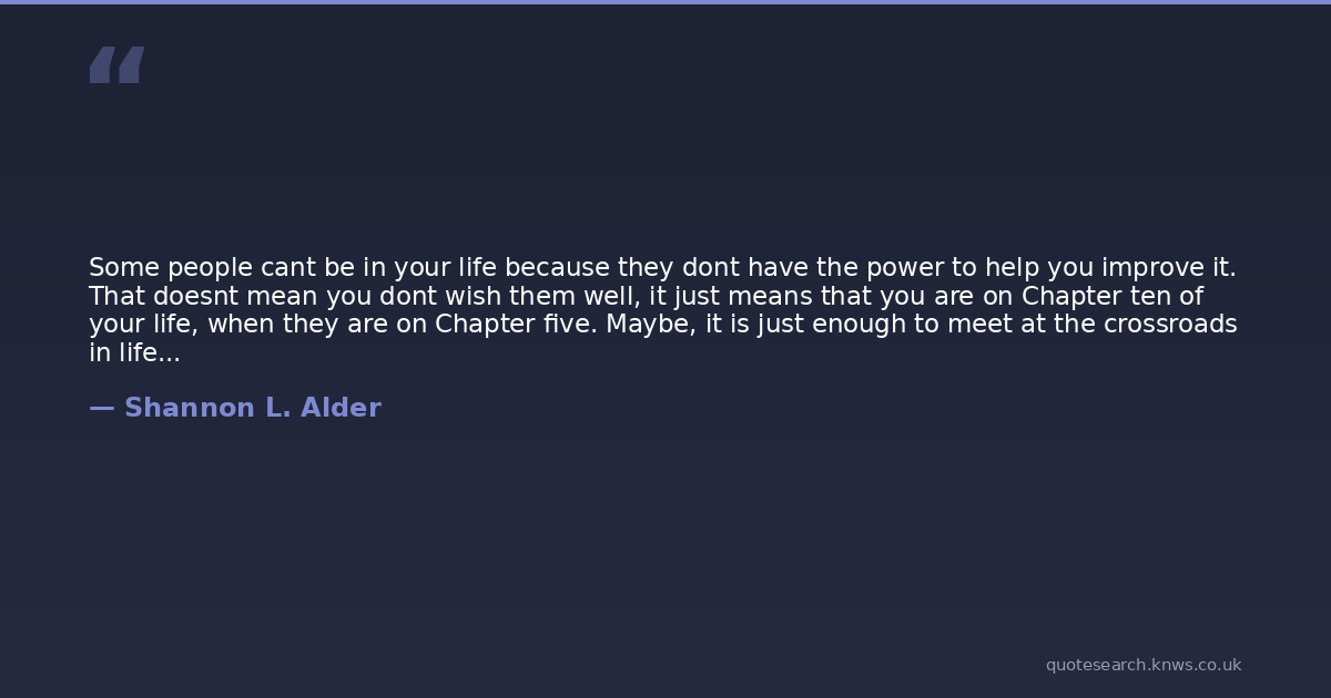 Some people cant be in your life because they dont have the power to help you improve it. That doesnt mean you dont wish them well, it just means that you are on Chapter ten of your life, when they are on Chapter five. Maybe, it is just enough to meet at the crossroads in life and agree to take separate paths, then with a cheshire grin you both look back and shout, Beat you to the top of the mountain, followed by the funnest sprint of both of your lives.