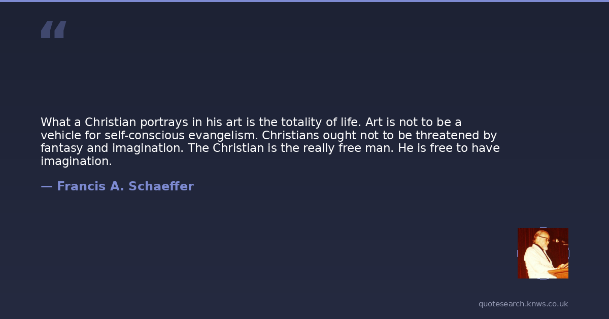 What a Christian portrays in his art is the totality of life. Art is not to be a vehicle for self-conscious evangelism. Christians ought not to be threatened by fantasy and imagination. The Christian is the really free man. He is free to have imagination.