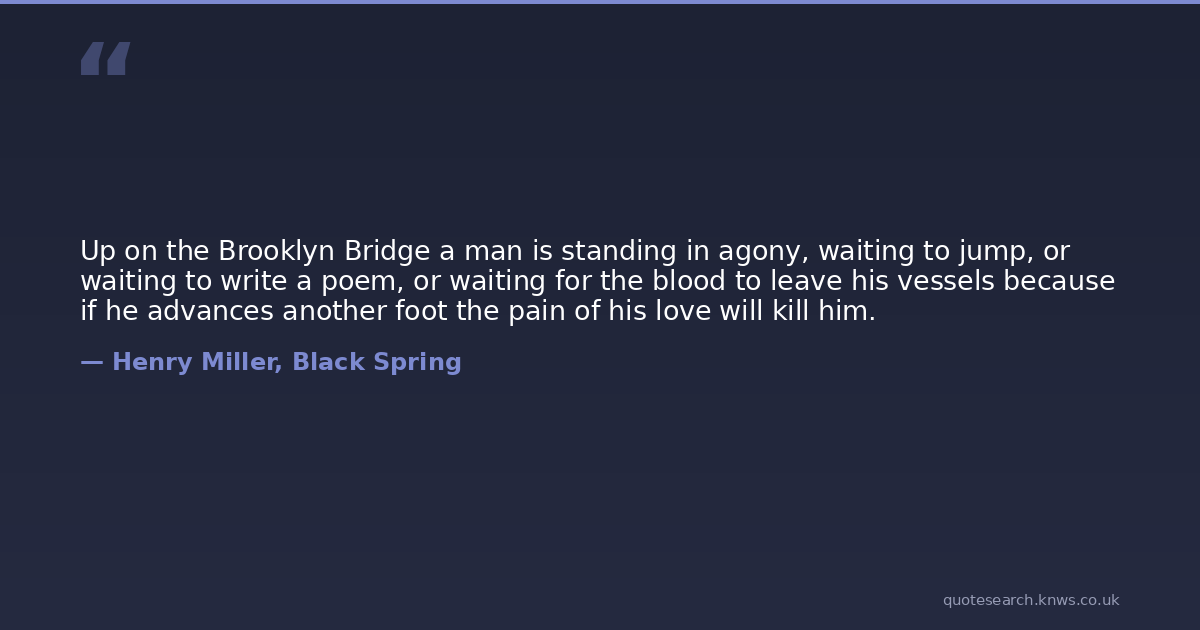 Up on the Brooklyn Bridge a man is standing in agony, waiting to jump, or waiting to write a poem, or waiting for the blood to leave his vessels because if he advances another foot the pain of his love will kill him.