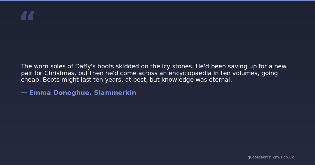 The worn soles of Daffy's boots skidded on the icy stones. He'd been saving up for a new pair for Christmas, but then he'd come across an encyclopaedia in ten volumes, going cheap. Boots might last ten years, at best, but knowledge was eternal.
