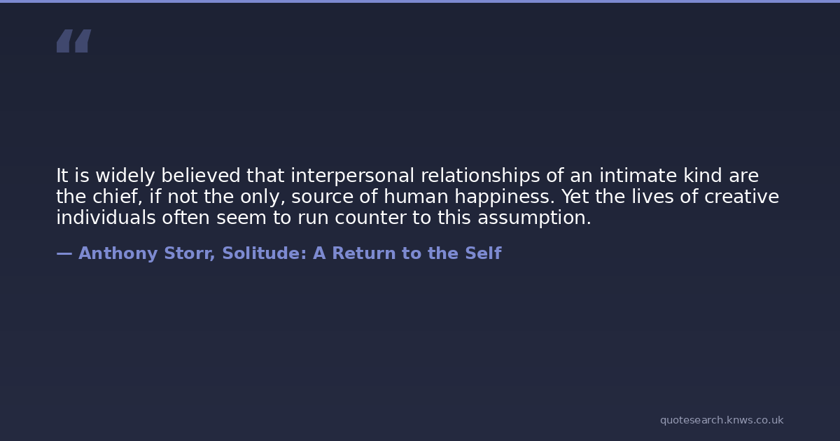 It is widely believed that interpersonal relationships of an intimate kind are the chief, if not the only, source of human happiness. Yet the lives of creative individuals often seem to run counter to this assumption.
